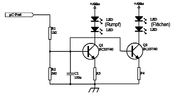 Die LEDs werden über eine kleine Treiberschaltung direkt aus dem Flugakku (hier: 8 Zellen) versorgt: